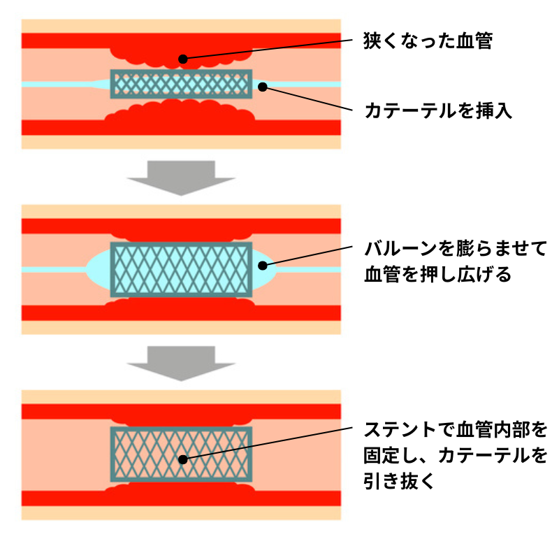 血管の中にできた血栓やプラーク(脂質)を取り除くために、手首または足のつけ根、鎖骨下からカテーテル(細い管)を差し込みます。先端には、ステント(特殊な網目上の金属筒)とバルーン(風船)が装着されています。血管が詰まっている箇所で、バルーンを膨らませて血管を押し広げ、その後バルーンをしぼませて抜き取るとステントが血管内に留置され、血流が再開します。