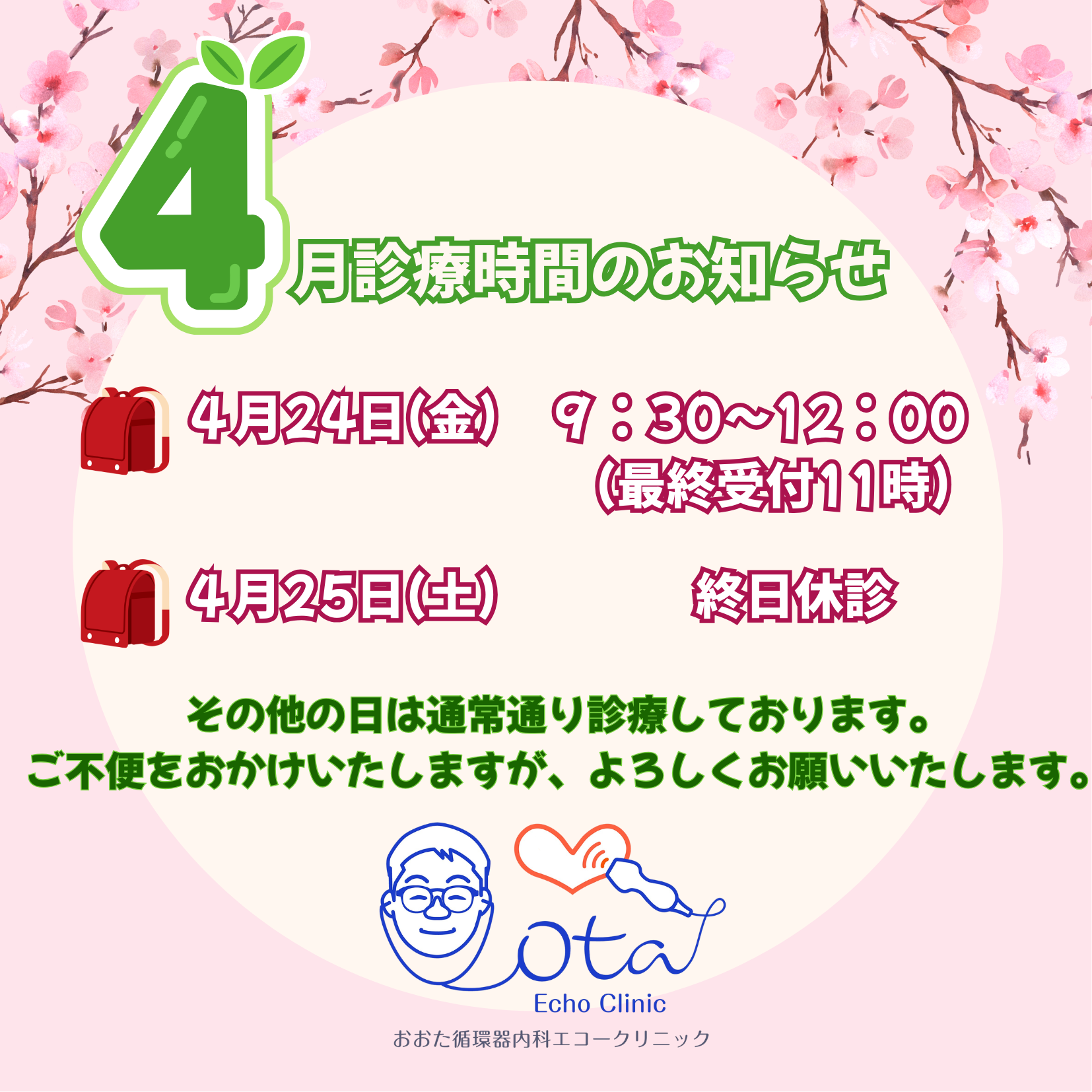 • 2025.04.30 休診日・診療時間のご案内